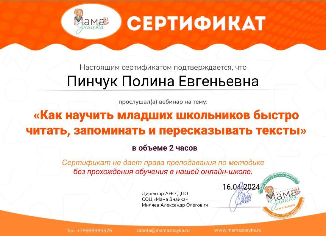 В апреле 2024 года приняла участие в вебинаре "Как научить младших школьников быстро читать, запоминать и пересказывать тексты"